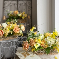 ミモザの小さな粒が、全体を軽やかにつないでくれます。ナチュラルな枝の動きも楽しみながら。。。