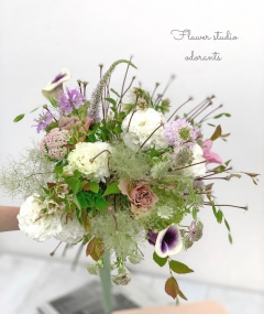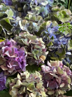紫陽花、スターチス、ラムズイヤーなどをshabbyのくすんだお色のお花を