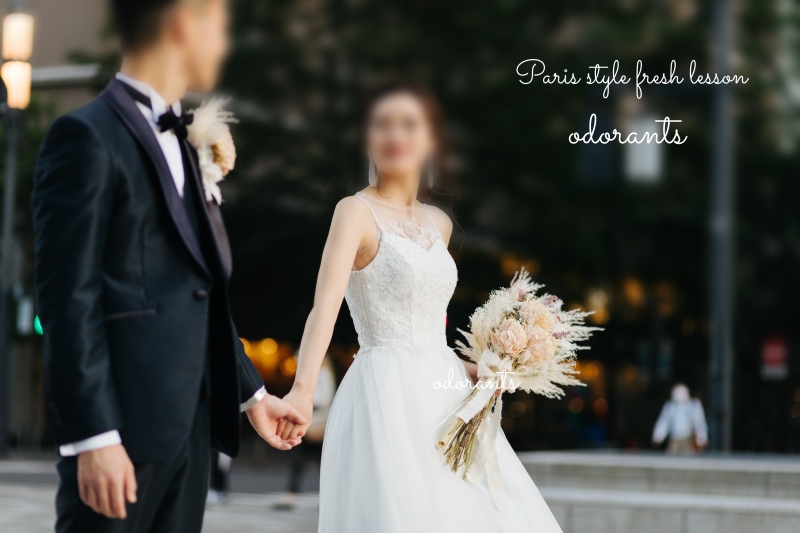 小ぶりなラウンドブーケはおしゃれさを引き立てます。