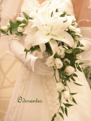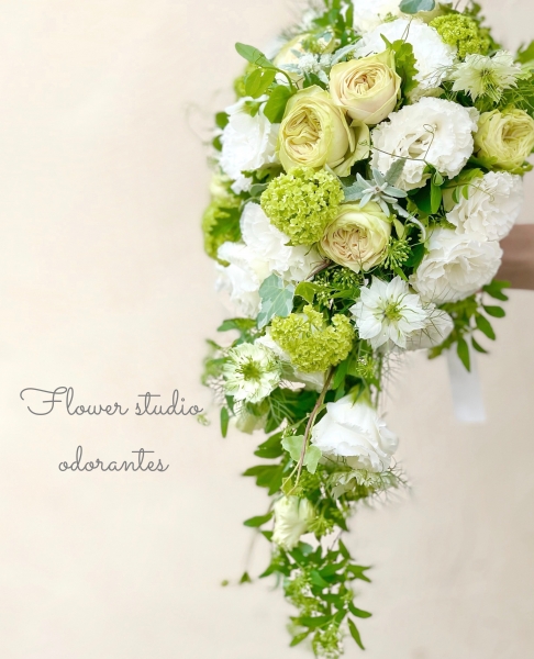 ドレスに合わせて色合いを決めます。エレガントなブーケですが、白ばかりではなく黄色系、ピンク系など個性的な色合いも可能です。